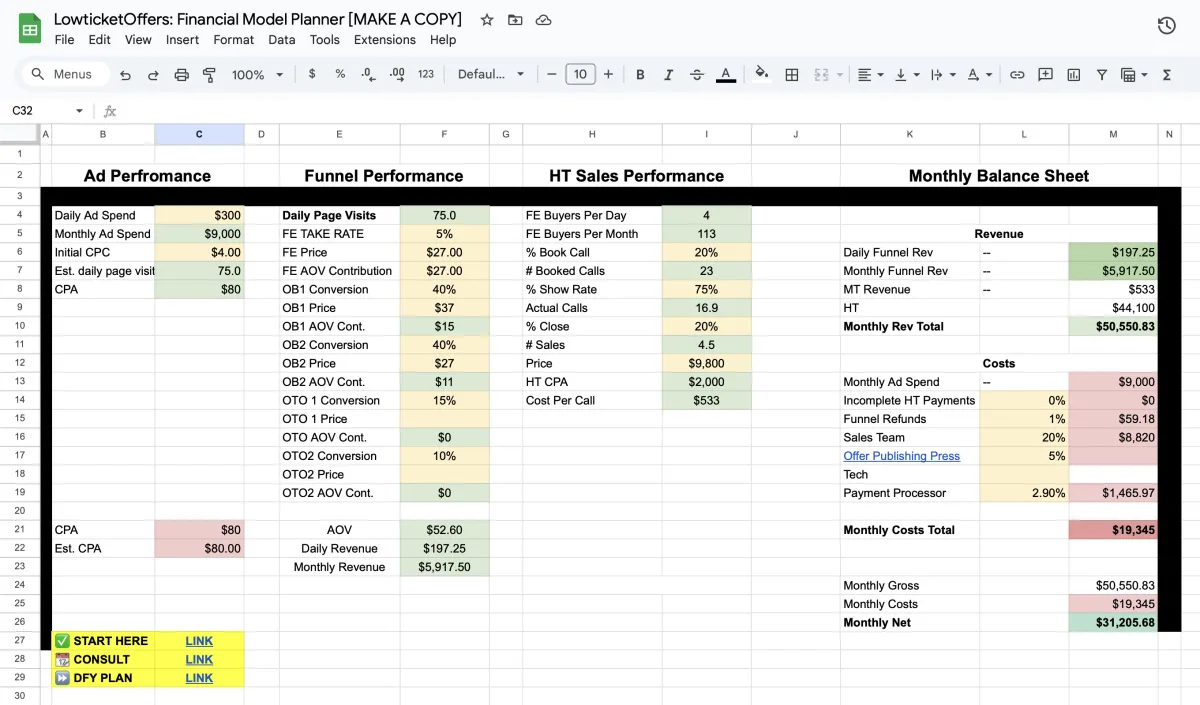 This template will show you how much you need to spend/liquidate to hit a million dollars per month with a lowticket call funnel.